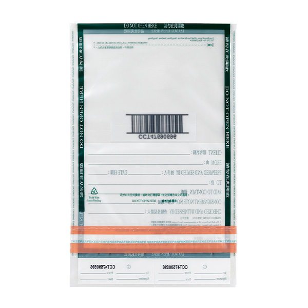 全PE材料,防篡改,抗撕扯能力,可印刷条形码,是银行、安保、零售等机构较好的包装解决方案